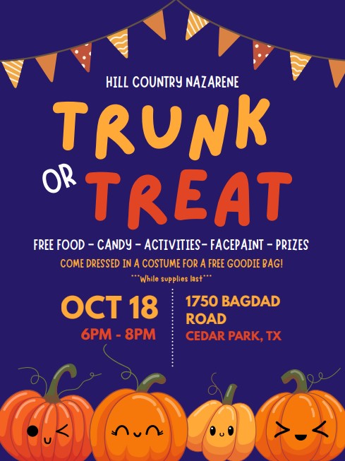 I am excited for our trunk or treat event that is coming up next weekend. We will need volunteers who don't want to do a trunk but still want to help out. I promise there is something for you to do to help out. If you have questions on what you can do, please ask anyone who is on the board or my wife. We have an amazing opportunity to bring the community together for a fun time. This Sunday is going to be amazing and I pray that the Lord will continue to use you to reach those around you. I am excited to worship with you this Sunday!